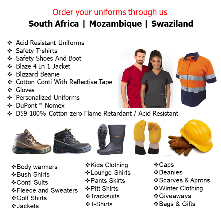 - In 2017, it held approximately 112 Uniform Supply Contracts between Mozambique Swaziland and South Africa, thus providing more than 98,000 Business Uniforms.